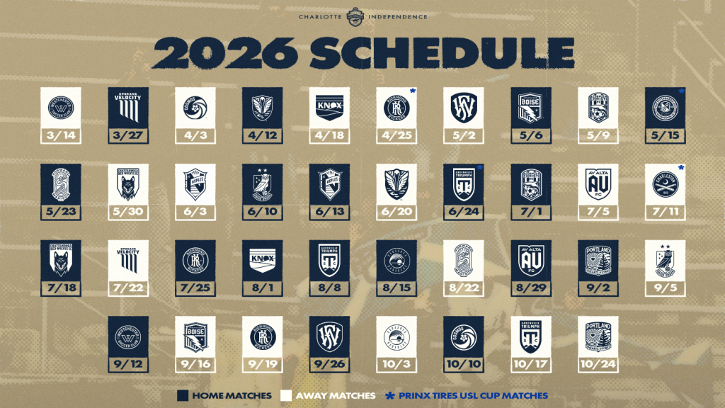 Across league play and the Prinx Tires USL Cup, the Independence will host 19 matches in 2026, split between American Legion Memorial Stadium and the Mecklenburg County Sportsplex at Matthews. Official locations for games besides the home opener will be announced at a later date.